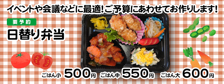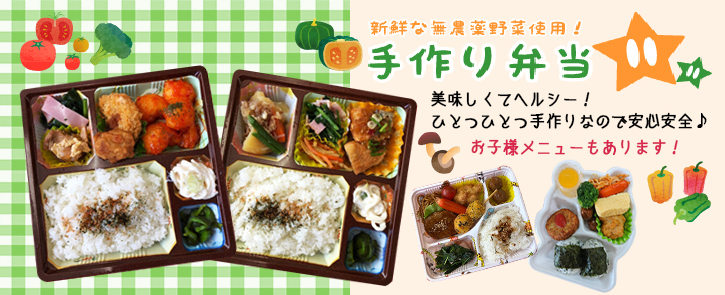 季節の野菜をたっぷり使ったお弁当は、ひとつひとつ手作りで、安心してお召し上がりいただけます。